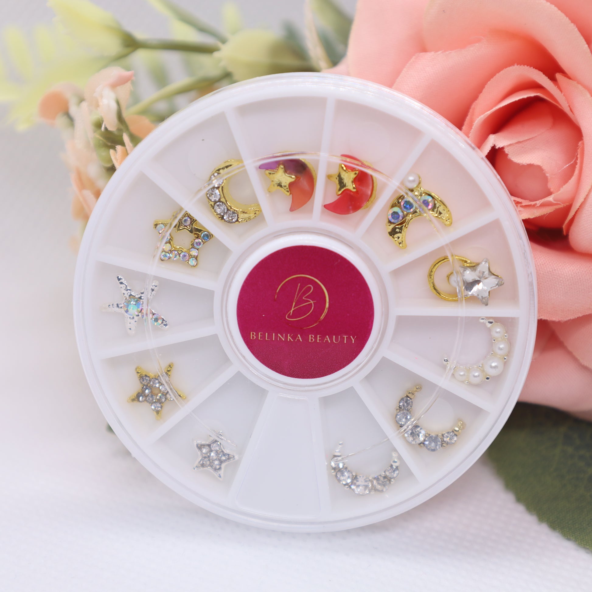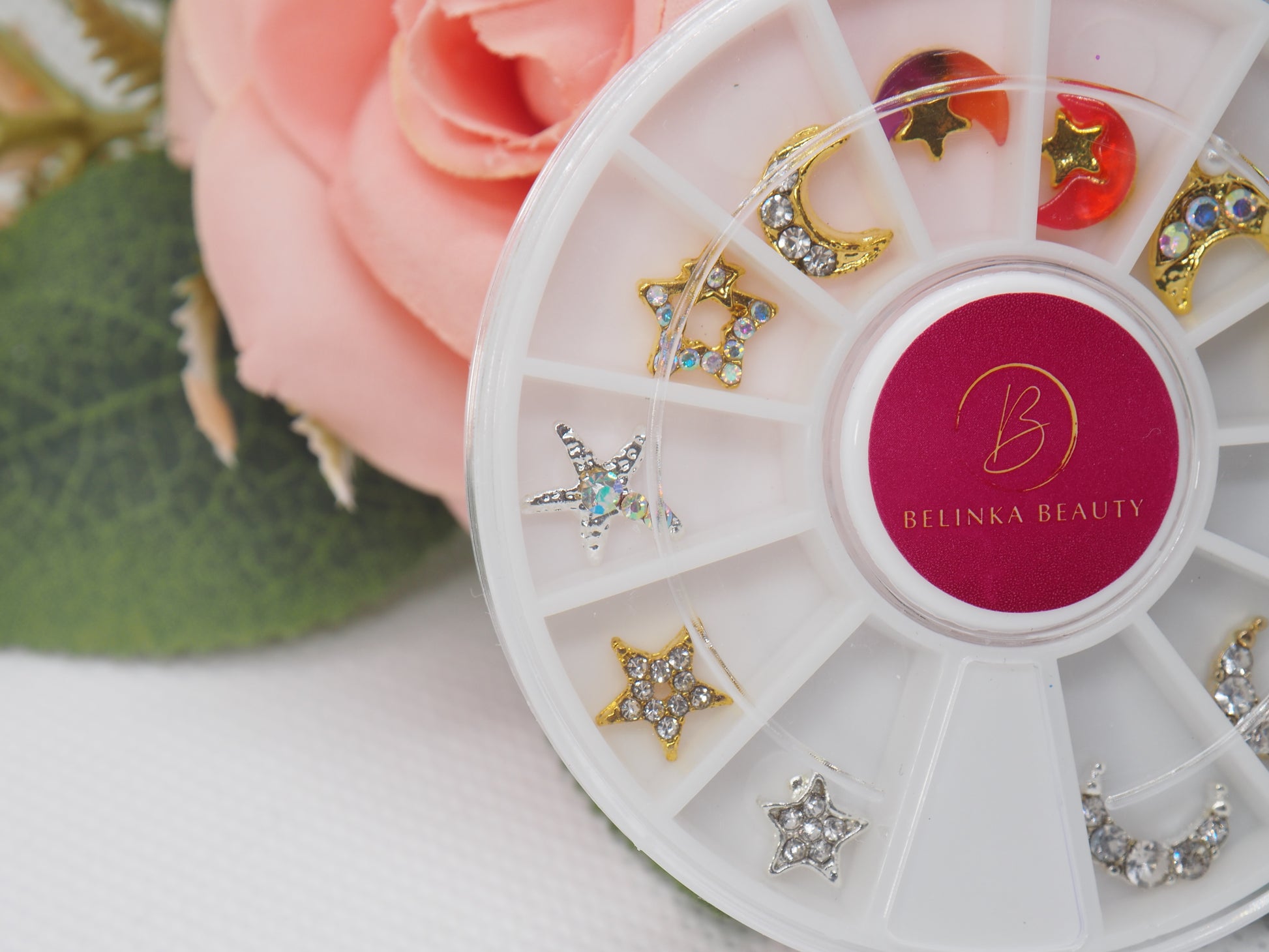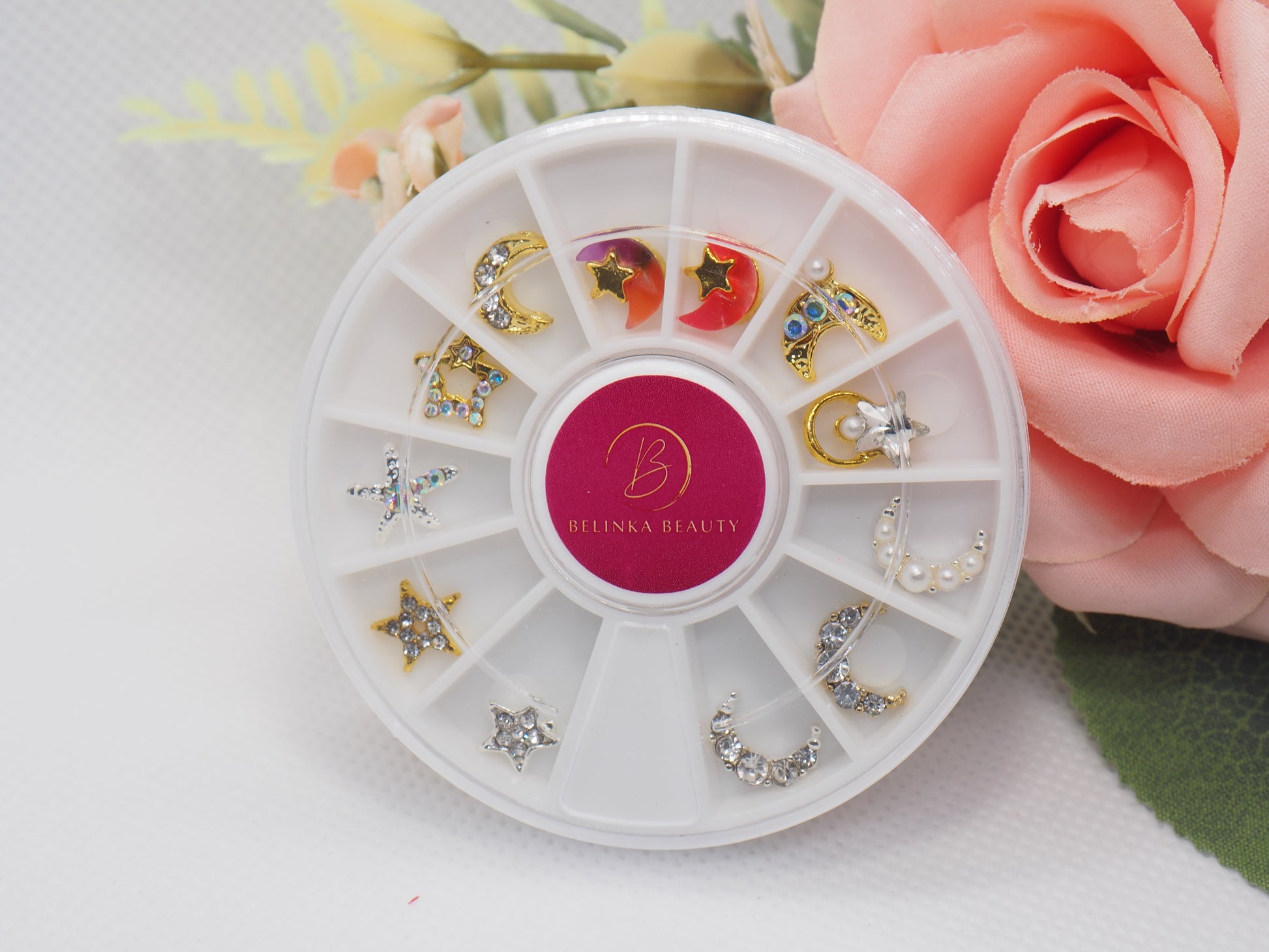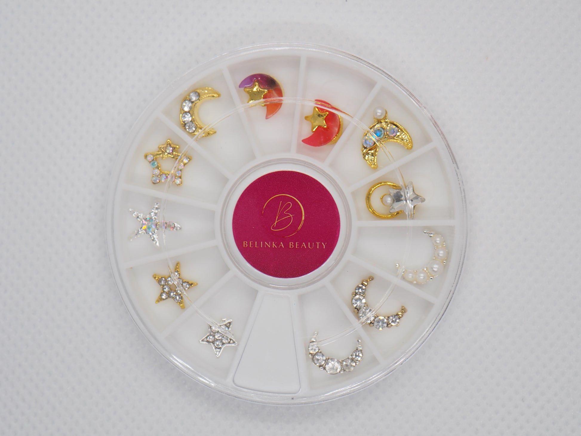 The carousel contains 12 beautiful pieces of high quality nail jewelry. They are gently rounded from the bottom to better fit the nail. Stones of various types and sizes have a bright and clear appearance and a diamond-like cut that casts significant reflections. The mixture of high-quality metals guarantees that the jewelry will remain shiny and bright for a long time without significant color changes. It doesn't darken, it doesn't blacken, it doesn't tarnish, and above all, it stays beautiful until the next nail makeover (using our Iconic Fixing gel).